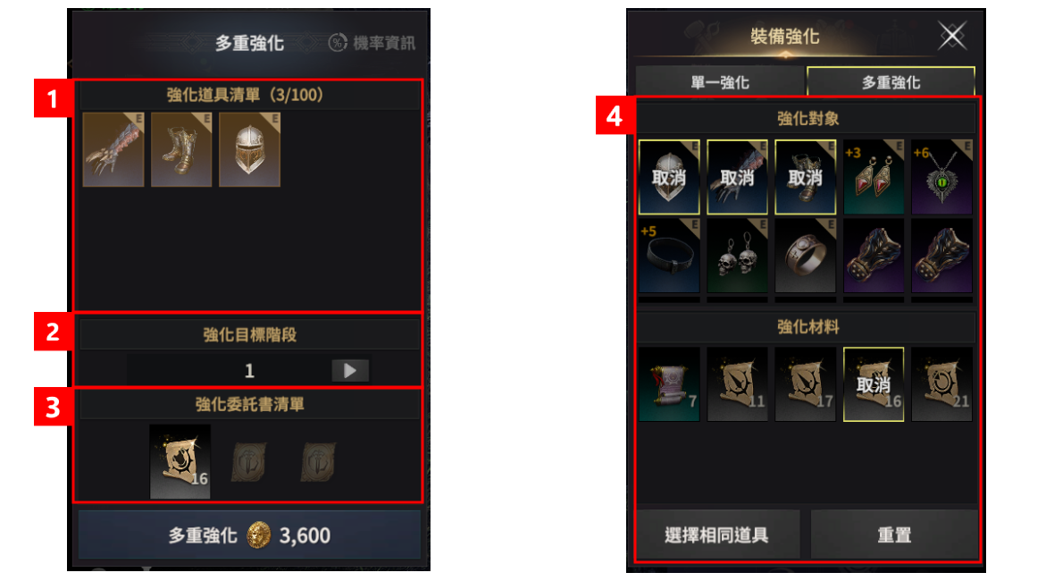 多重強化為可一次登錄多件相同種類裝備,並自動強化至指定強化階段的系統。