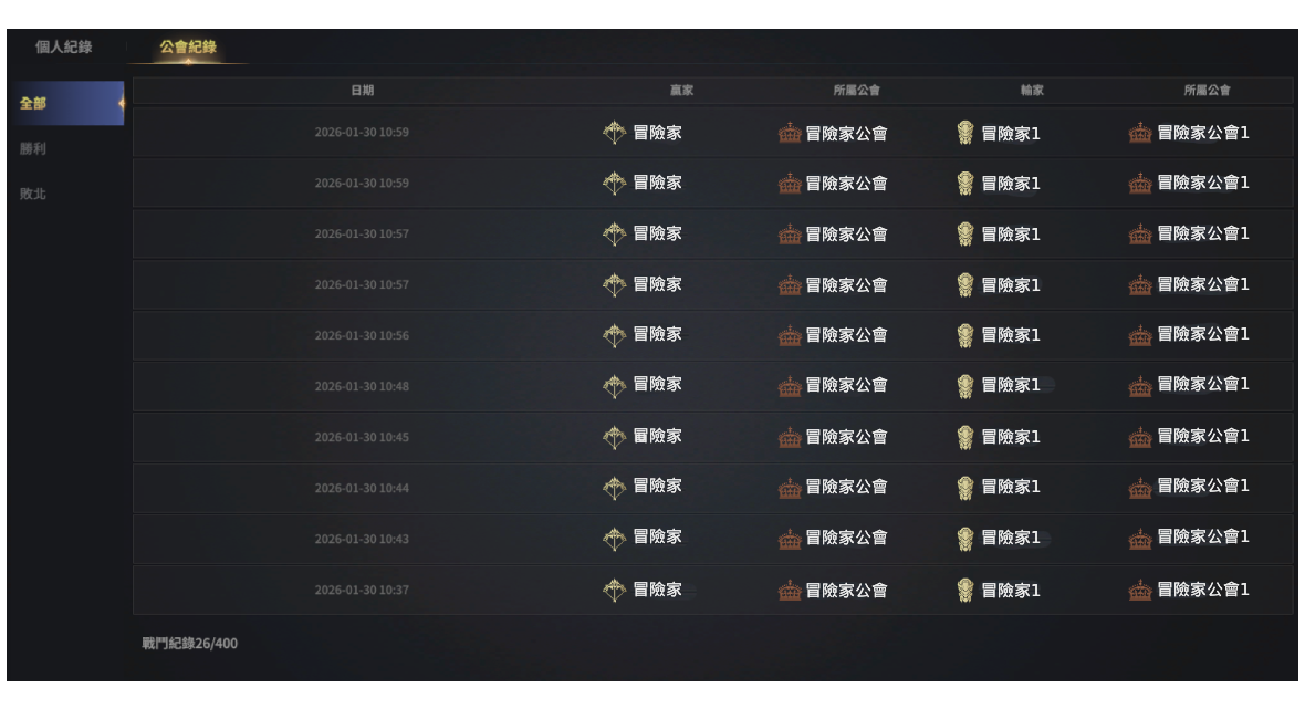 若目前所屬公會的成員進行 PVP,可在公會紀錄中查看其結果。