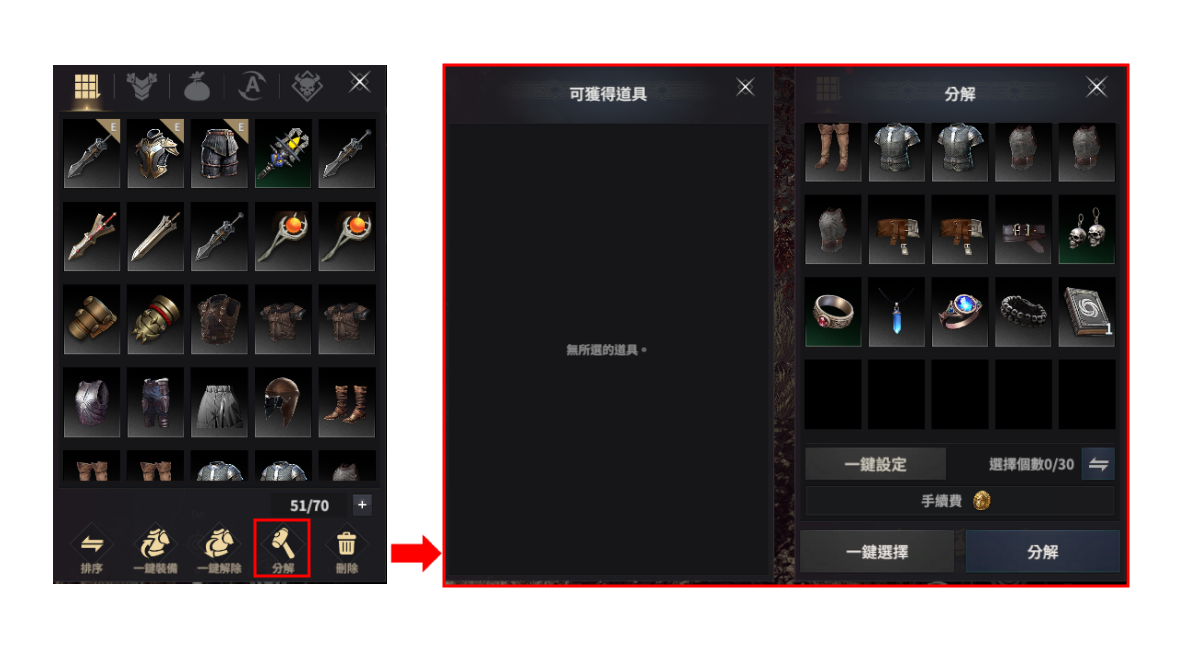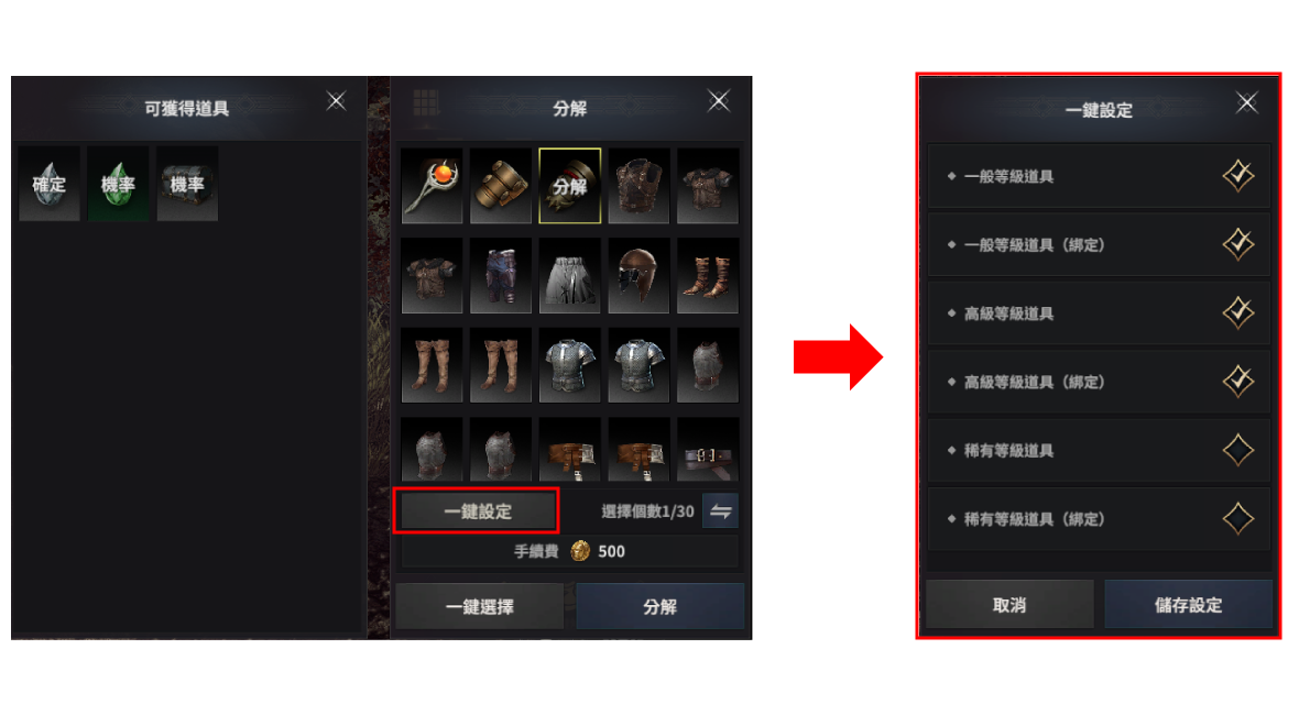 事先儲存【一鍵設定】後,可一次選取指定等級的道具進行批次分解。