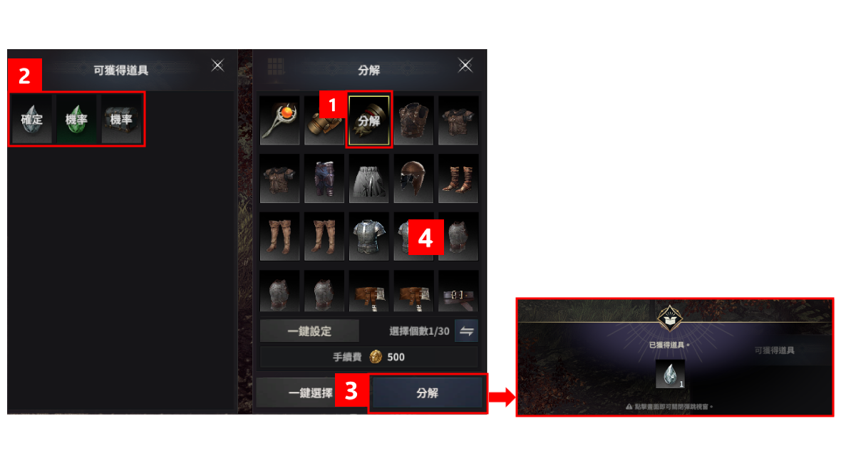 進行道具分解時,該道具將消失,並依分解道具的種類與等級獲得對應材料。