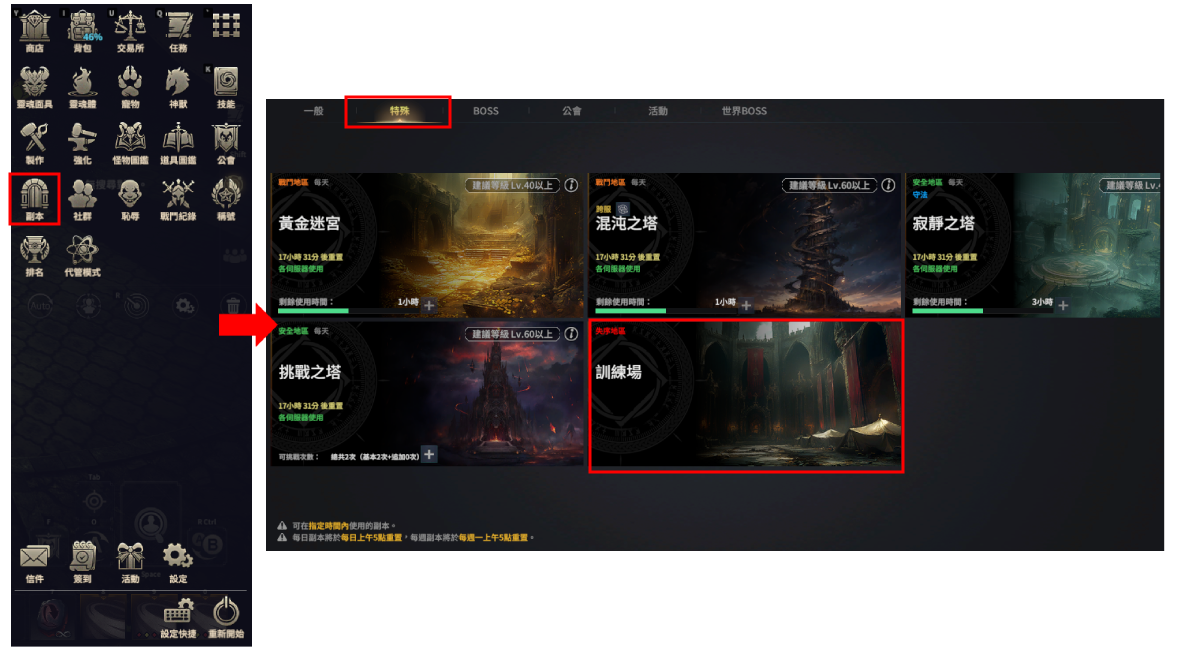 入場路徑:選單 → 副本 → 特殊 → 訓練場。