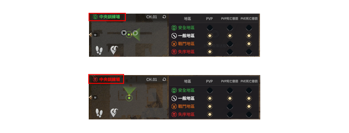 訓練場內同時存在「安全地區(不可 PVP)」與「失序地區(可 PVP)」。