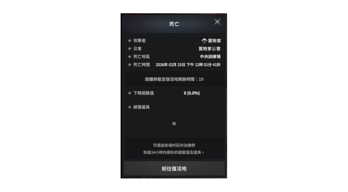 訓練場內死亡不會產生死亡懲罰;點選【前往復活地】時,將移動至訓練場內的安全地區。