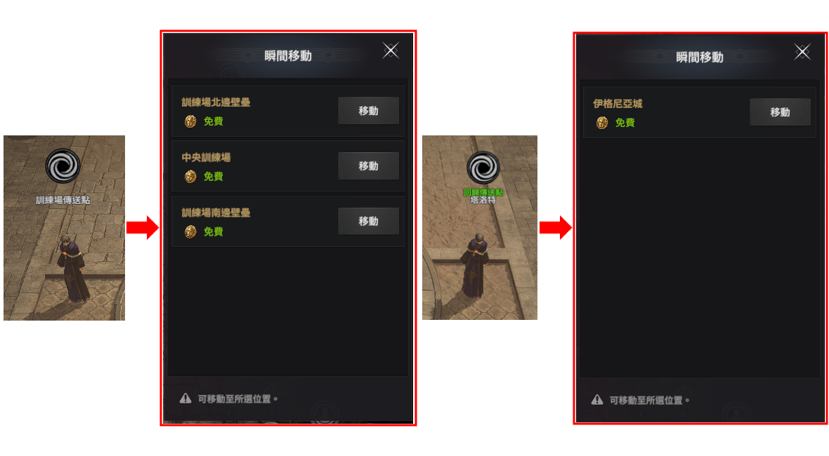 訓練場傳送點 NPC:可協助玩家在訓練場內各區域間進行瞬間移動。