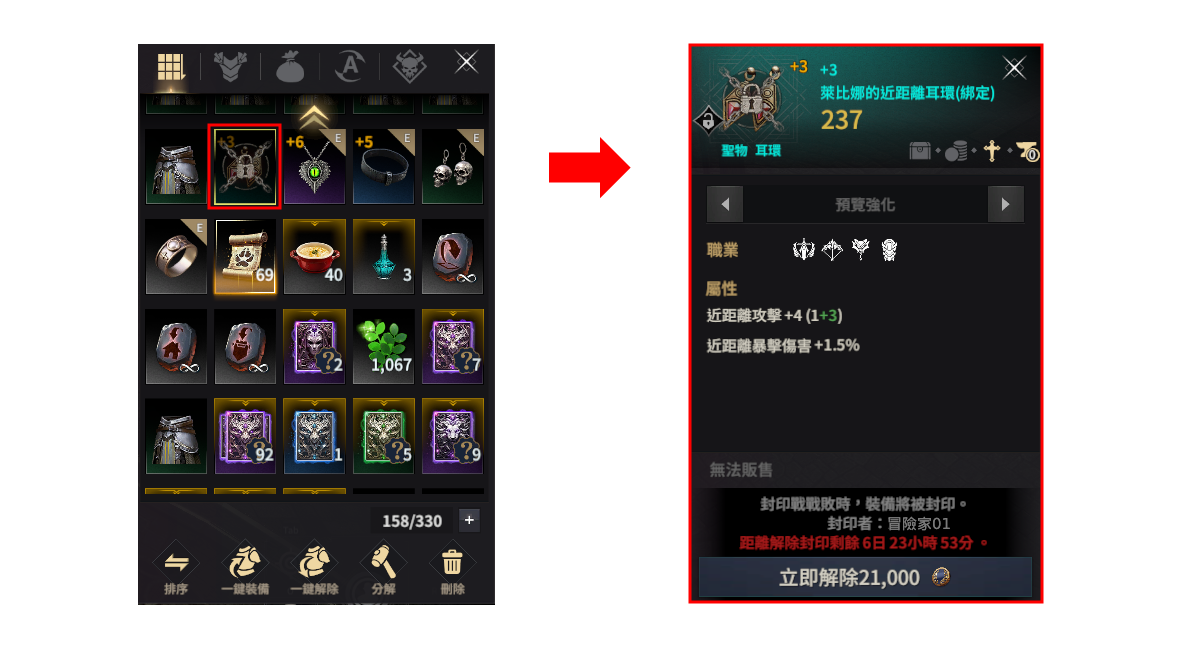 被封印的功能於一定時間內無法使用;亦可使用名譽鑄幣並消耗指定費用立即解除封印。