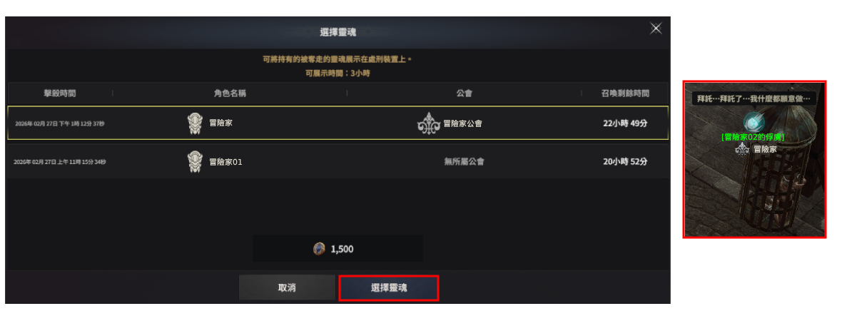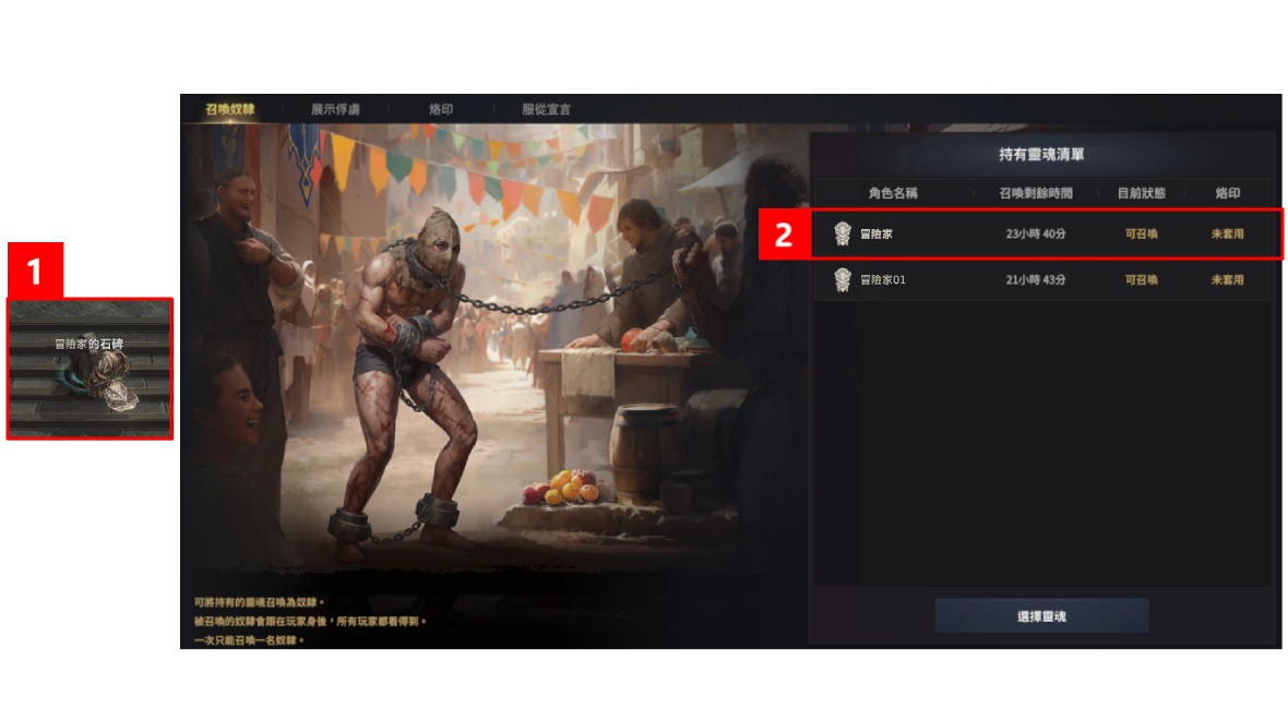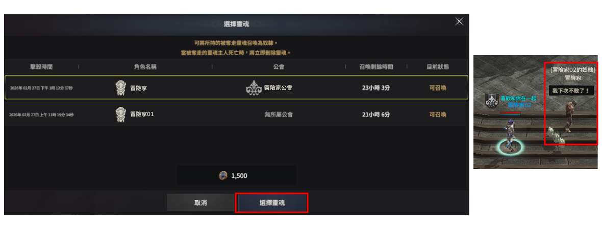 於【持有靈魂清單】中選擇欲召喚為奴隸的角色名稱後,點選【選擇靈魂】即可召喚奴隸。