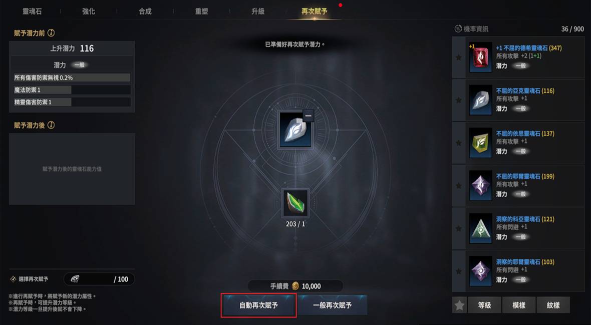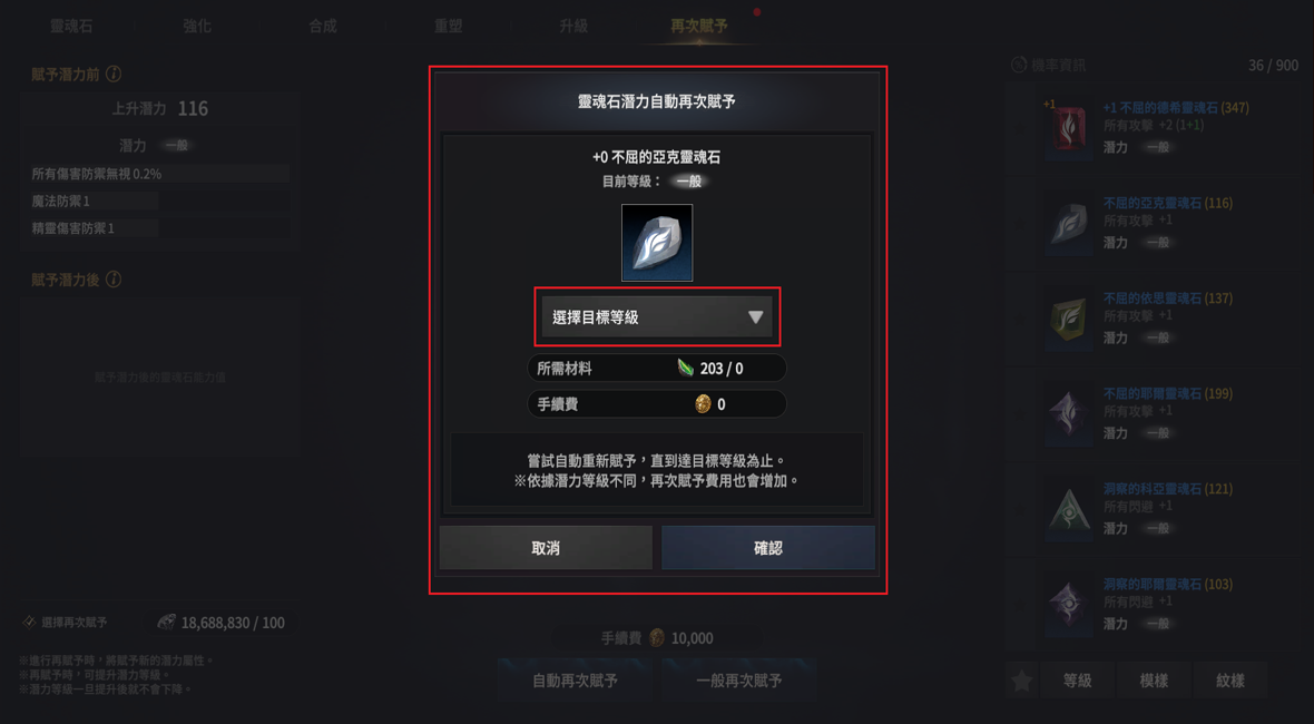 自動再次賦予時將消耗靈魂石結晶與手續費,且潛力等級越高,所需費用亦會提升。