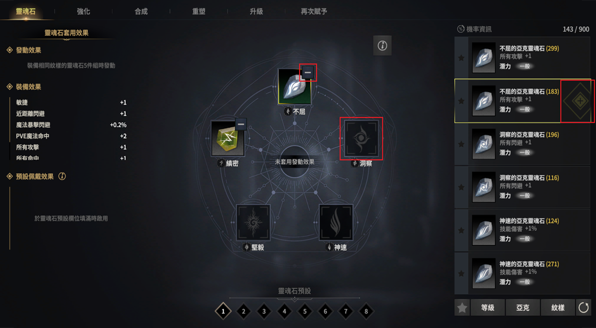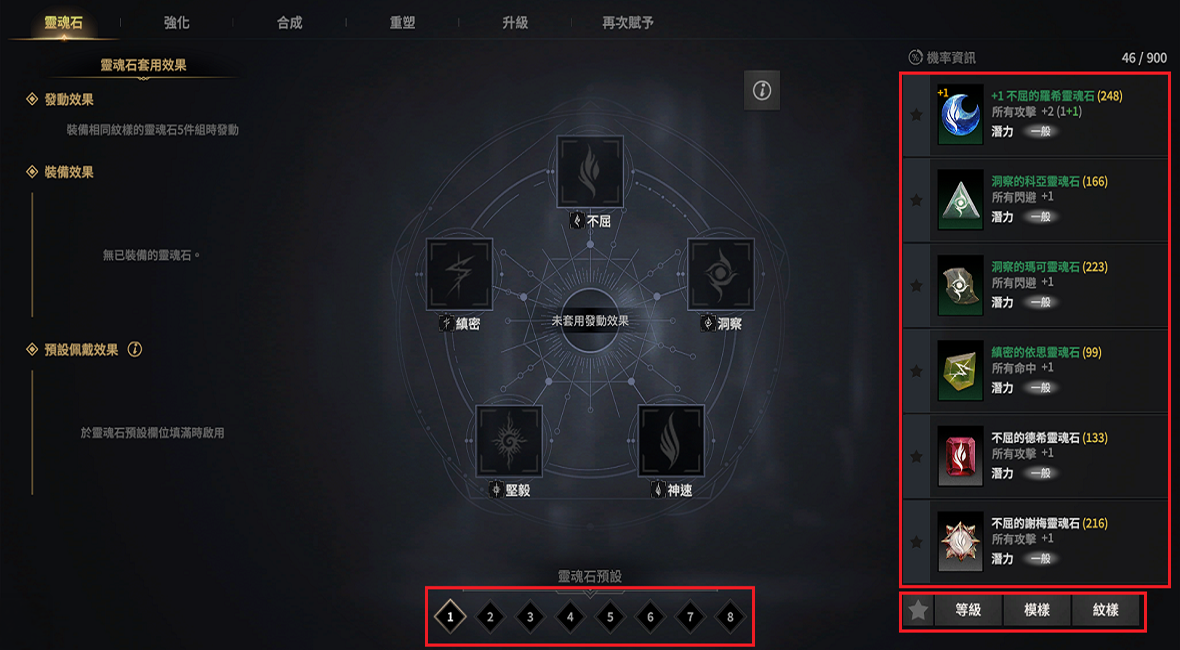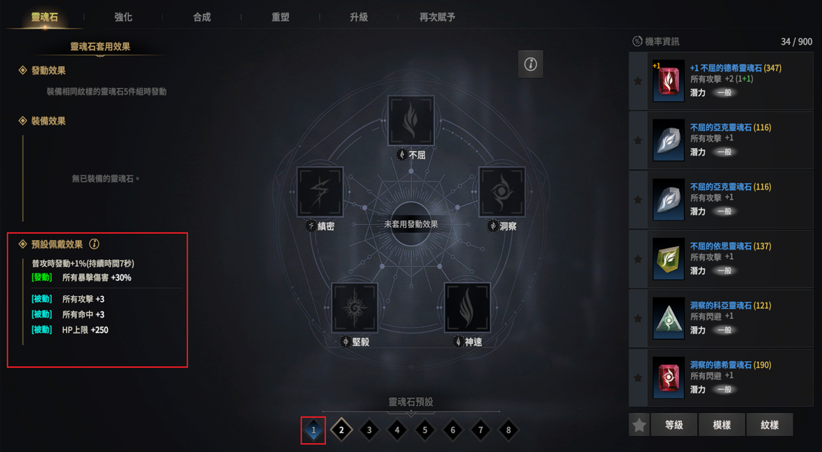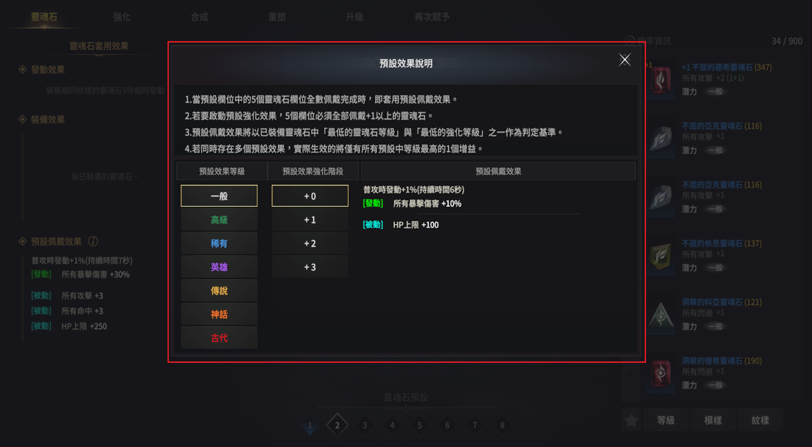 預設佩戴效果將以該預設中最低等級的靈魂石為基準啟用。