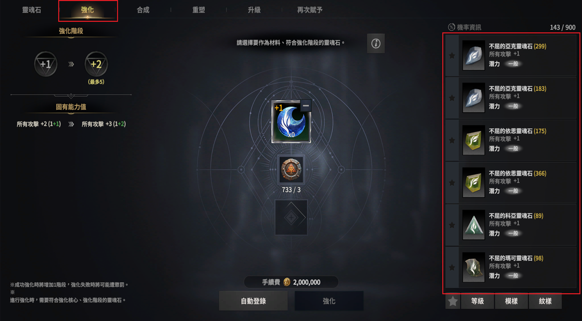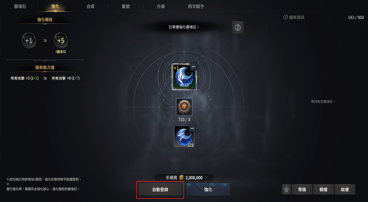 點選【自動登錄】時,系統將自動登錄相同等級的靈魂石作為強化材料。