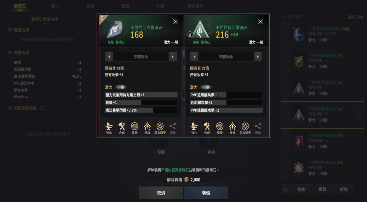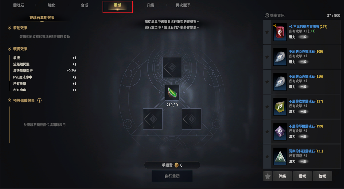 重塑需消耗 2 個相同等級的靈魂石 與「靈魂石結晶」。