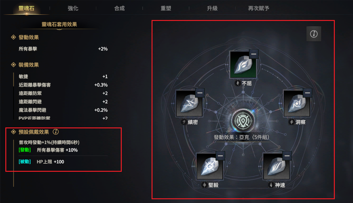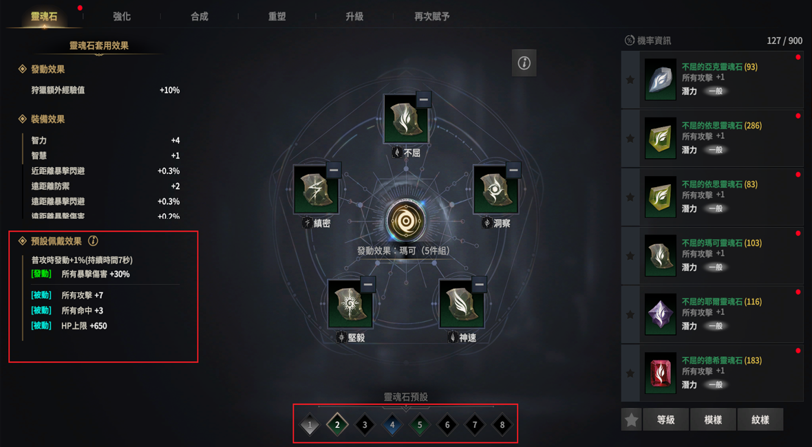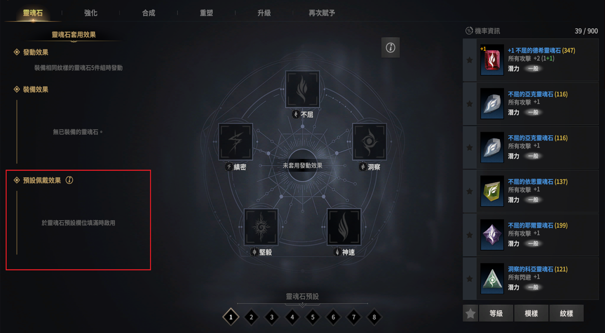預設佩戴效果為當某一預設中的 5 個靈魂石槽位皆裝備靈魂石時,可獲得額外效果的系統。