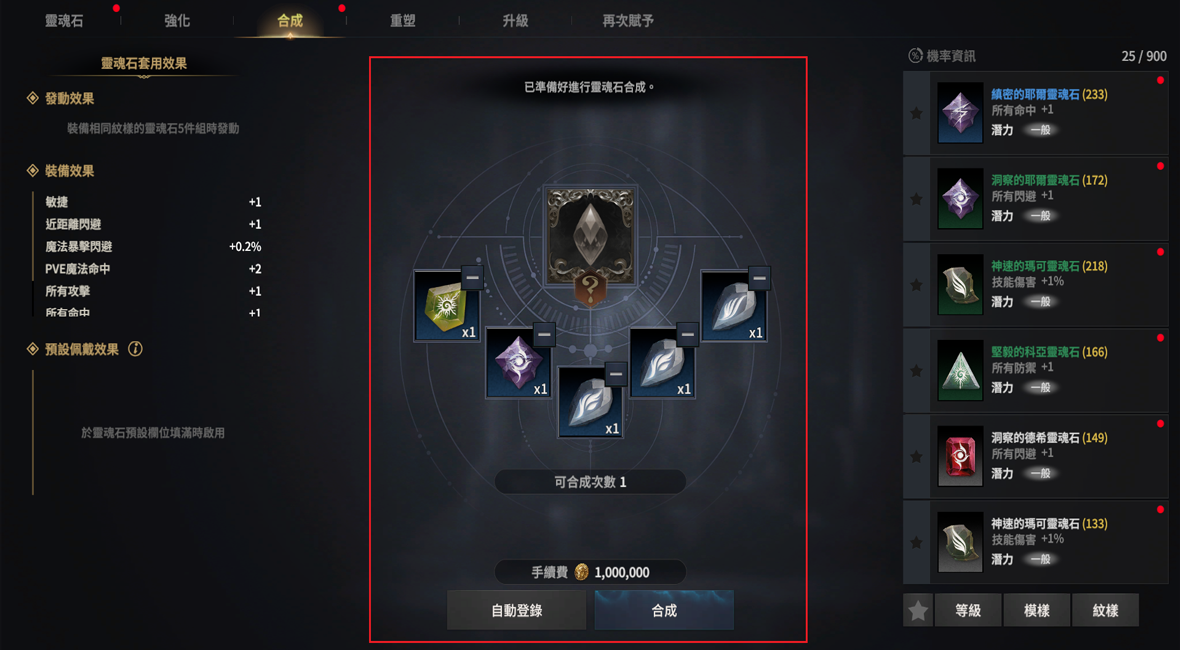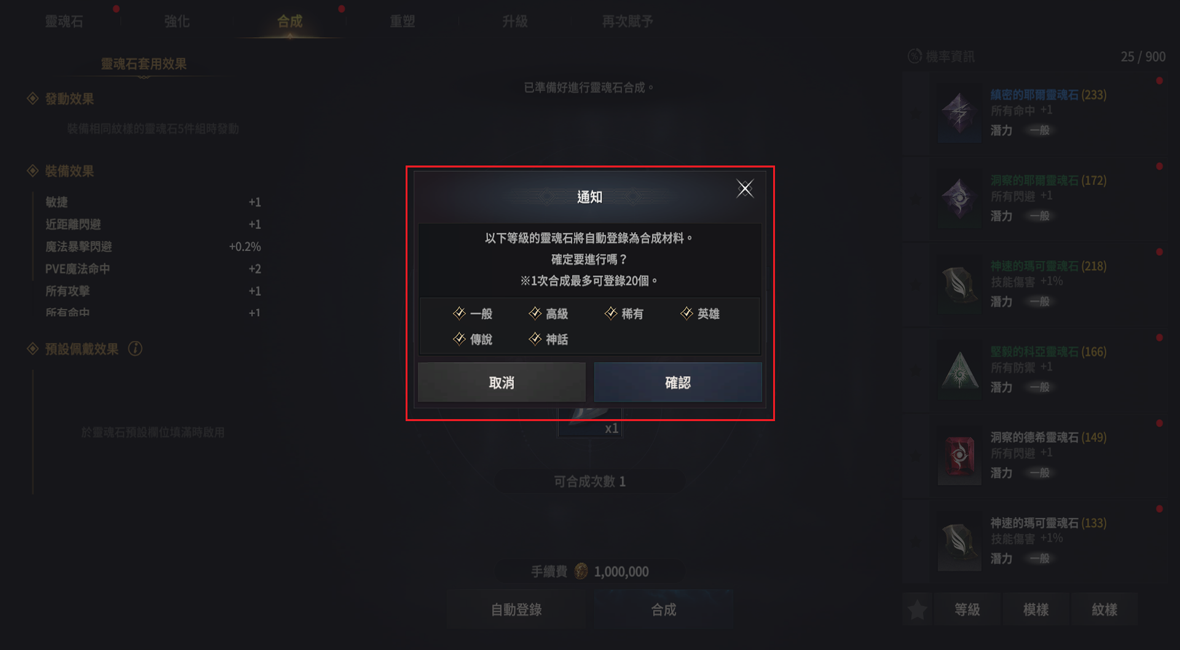 合成需使用 5 個相同等級的靈魂石,且一次最多可登錄 20 個進行合成。