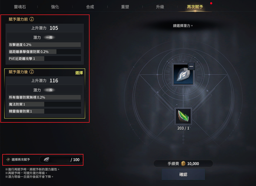 可透過潛力再次賦予功能變更靈魂石的潛力能力值。