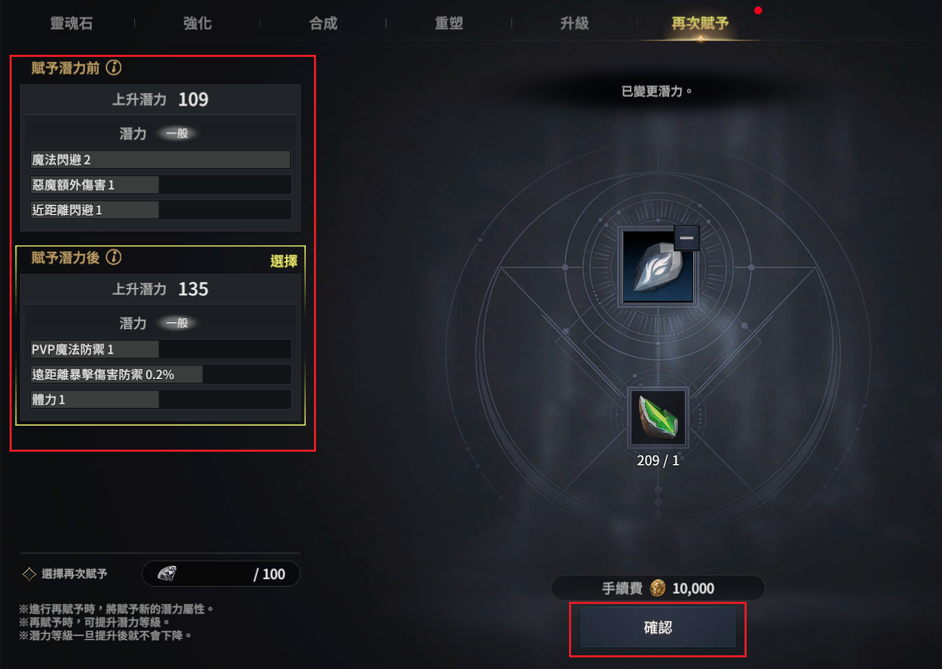 再次賦予時 3 條潛力能力會同時變更,並可透過【確認】套用再次賦予結果。